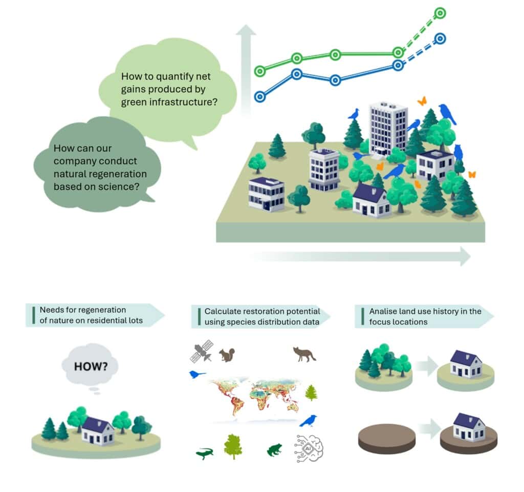 Urban biodiversity restoration provides an opportunity to mitigate the effects of climate change and ecosystem degradation as they can serve as safeguards of biodiversity while enhancing social value in the neighbourhoods they occupy. Many real estate developers are engaged in the creation of these urban green areas, but they face challenges in quantifying the net gain produced by green infrastructure and conducting nature restoration based in science.